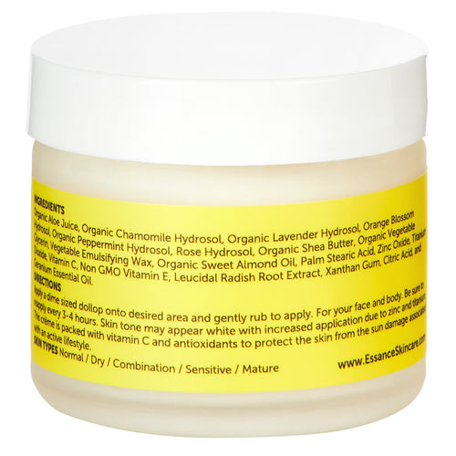 Organic Aloe Juice, Organic Chamomile Hydrosol, Organic Lavender Hydrosol, Orange Blossom Hydrosol, Organic Peppermint Hydrosol, Rose Hydrosol, Organic Shea Butter, Organic Vegetable Glycerin, Vegetable Emulsifying Wax, Organic Sweet Almond Oil, Palm Stearic Acid, Zinc Oxide, Vitamin C, Non-GMO Vitamin E, Leucidal Radish Root Extract, Xanthan Gum, Citric Acid, and Geranium Essential Oil.